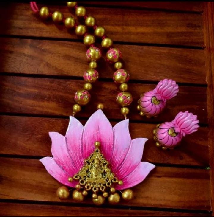 Lakshmi Terracotta Jewellery is a type of handmade jewellery made from terracotta clay. It is named after the Hindu goddess of wealth and prosperity, Lakshmi. The jewellery is made using a unique and intricate process involving shaping, carving, and painting of the clay to create beautiful and artistic designs.